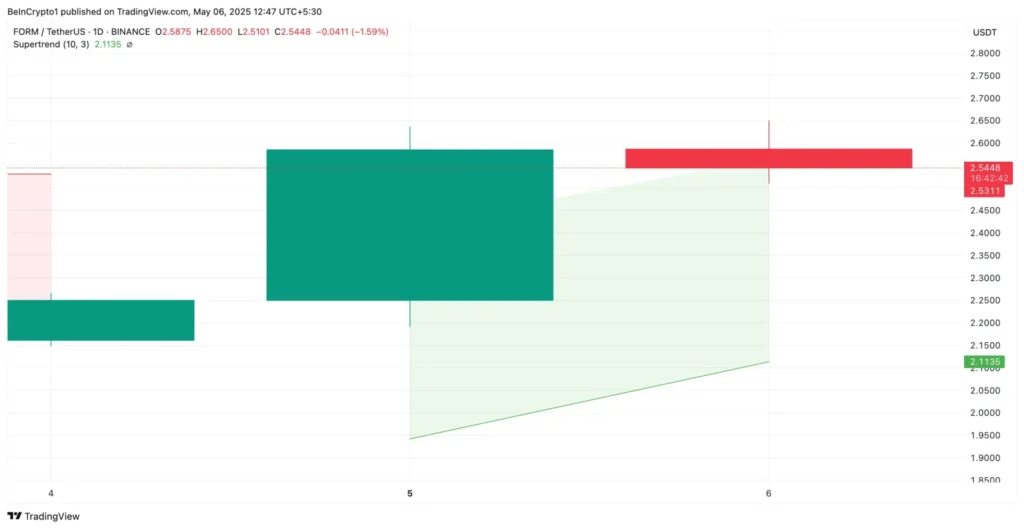 Hiện tại, token FORM đang giao dịch trên ngưỡng chỉ báo Supertrend, cho thấy một mức hỗ trợ động đáng kể tại mức 2.11 USD. Supertrend theo dõi xu hướng giá và sức mạnh của tài sản, biểu hiện dưới dạng một đường màu trên biểu đồ giá. Khi đường này chuyển sang màu xanh, nghĩa là xu hướng đang đi lên, và sắc đỏ báo hiệu xu hướng giảm.