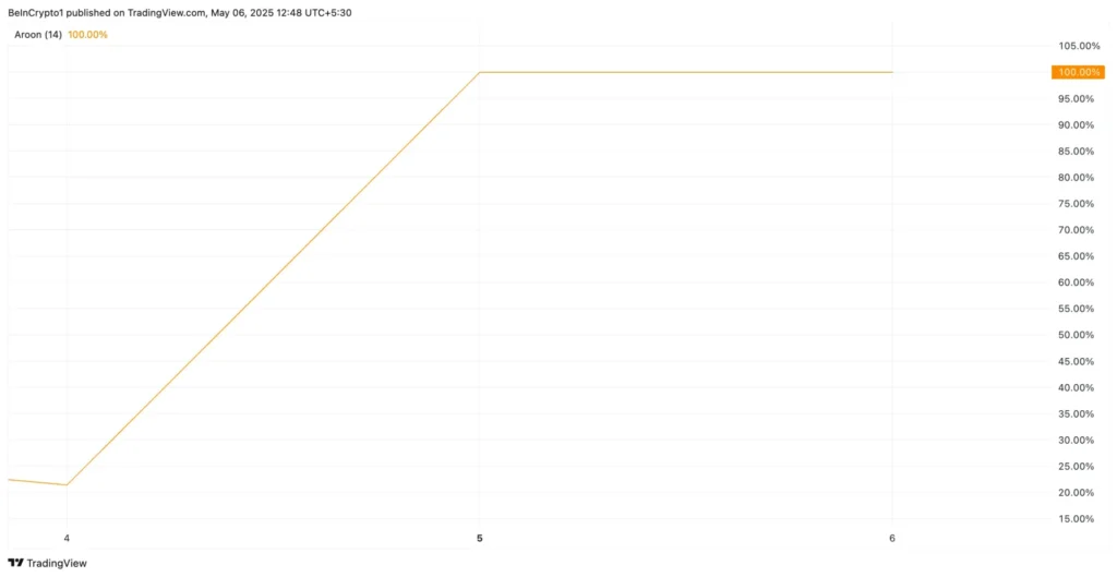 Chỉ số Aroon Up Line của FORM hiện đang đạt mức 100%, cho thấy đà tăng trưởng mạnh mẽ của nó. Chỉ báo Aroon đo lường sức mạnh và xu hướng của tài sản bằng cách theo dõi khoảng thời gian tính từ lúc giá đạt mức cao nhất và thấp nhất trong một khoảng thời gian cụ thể.