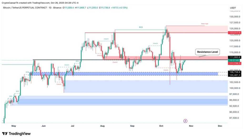 - Trader Crypto Caesar nhận định rằng mức kháng cự 112.000 USD đang được kiểm tra lại. Ông chia sẻ: “Nếu Bitcoin phá vỡ rõ ràng và đóng cửa trên mức này, xu hướng tăng dài hạn sẽ được xác nhận, mục tiêu tiếp theo nằm ở vùng giá 123.000 USD.”