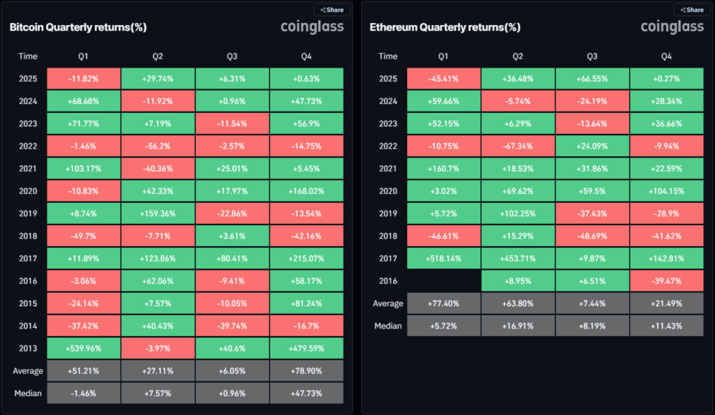 - Lịch sử tăng trưởng trong quý IV: Trong ba năm liên tiếp gần đây, Bitcoin và Ethereum đều ghi nhận lợi nhuận tích cực trong quý IV, làm tăng khả năng đà tăng này sẽ tiếp tục vào năm 2025.