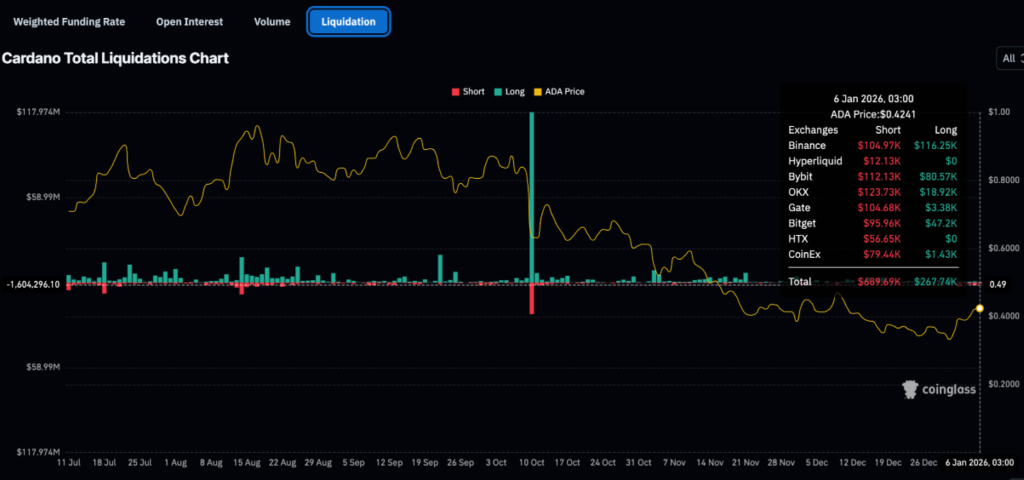 - Vị thế bị thanh lý: Giá trị các vị thế bán khống (Short) bị thanh lý khoảng 690.000 USD, cao hơn nhiều so với các vị thế mua (Long) chỉ khoảng 268.000 USD, điều này phần nào tạo động lực hỗ trợ đà tăng của ADA.