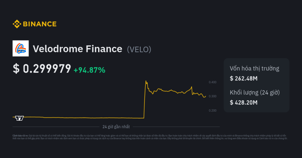 Sự kiện niêm yết giao ngay của VELODROME trên sàn Binance đã gây chú ý mạnh mẽ trong cộng đồng tiền mã hóa, đánh dấu một cột mốc quan trọng cho dự án này. Ngay sau khi ra mắt, giá của token VELODROME đã ghi nhận mức tăng đáng kể, vượt mốc 200%, phản ánh sự quan tâm và tin tưởng từ phía các nhà đầu tư.