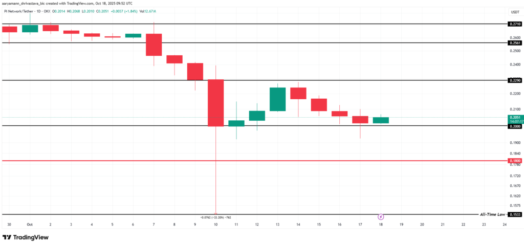 - Giá Pi Coin duy trì trên mức hỗ trợ $0,200, đã từng đóng vai trò là điểm tựa giúp thị trường phục hồi trong quá khứ.