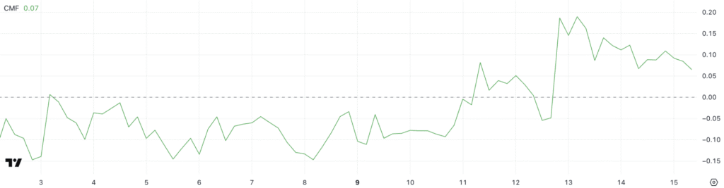 Chỉ số CMF hiện tại của Pi Network là 0.07, giảm từ mức 0.19 hai ngày trước, nhưng vẫn cao hơn so với mức -0.05 ba ngày trước đó. Chỉ số CMF, đo lường dòng tiền vào và ra khỏi tài sản theo thời gian, cho thấy rằng dù áp lực mua vẫn có nhưng mức độ không mạnh mẽ như trước.