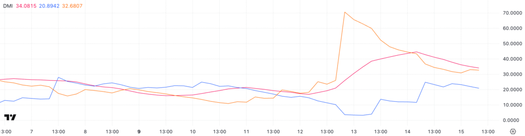 Mức ADX dưới 20 thường gợi ý một xu hướng yếu hoặc không rõ ràng, trong khi giá trị trên 25 báo hiệu một xu hướng mạnh mẽ hơn. Dù ADX vẫn còn nằm trên mức 30, PI có khả năng đang trong trạng thái có xu hướng, nhưng mạch động lực dường như đang chậm lại.