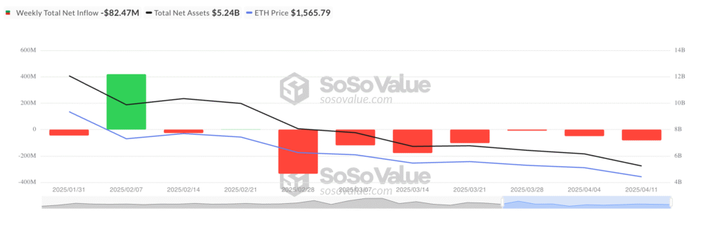 Trong tuần này, tổng dòng tiền rút ra từ các quỹ ETF spot Ethereum đạt 82,47 triệu USD, tăng 39% so với mức 49 triệu USD của tuần trước. Sự ra đi liên tục của dòng vốn này đang tạo ra một làn sóng áp lực bán mạnh mẽ lên giá ETH.