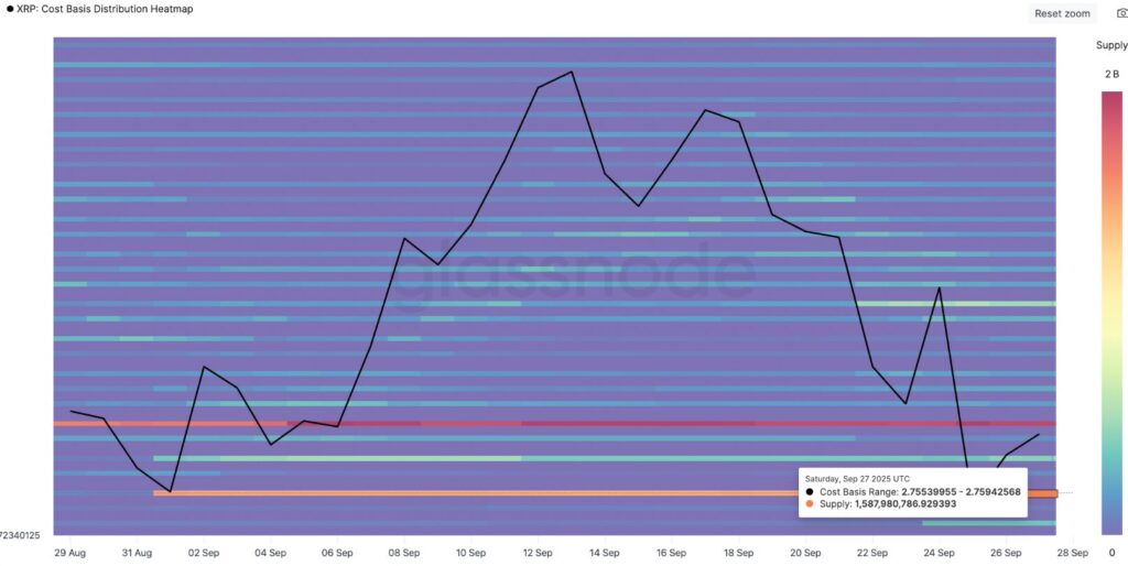 Bản đồ nhiệt từ Glassnode cho thấy có một khối lượng lớn cầu ở mức 2,75 USD, với khoảng 1,58 tỷ XRP đã được mua. Điều này càng khẳng định tầm quan trọng của mức giá này. Tuy nhiên, cũng cần lưu ý rằng mức 2,81 USD (được hỗ trợ bởi SMA 100 ngày) có thể tạo ra một bức tường cản trở bất kỳ nỗ lực phục hồi nào trong ngắn hạn.