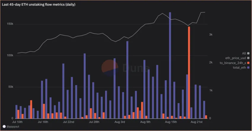 Một điểm quan trọng cần lưu ý là việc unstaking không hề có nghĩa là những người sở hữu ETH sẽ ngay lập tức đưa ra bán. Trong thực tế, nhiều nhà đầu tư có thể tiếp tục giữ lại tài sản của mình, mong chờ mức giá cao hơn hoặc tìm kiếm cơ hội trong thế giới DeFi đang phát triển. Dữ liệu từ Dune Analytics cho thấy trong 45 ngày qua không có một sự kết nối rõ ràng giữa khối lượng ETH được unstake và sự biến động giá của đồng tiền này.