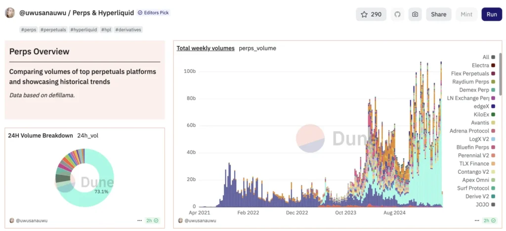 Dữ liệu từ Dune Analytics cho thấy Hyperliquid chiếm đến 73,1% thị phần trong giao dịch hợp đồng tương lai (perps), với tổng khối lượng giao dịch lên tới 12,09 tỷ USD, trong đó sự góp mặt của Wynn đóng vai trò quan trọng.