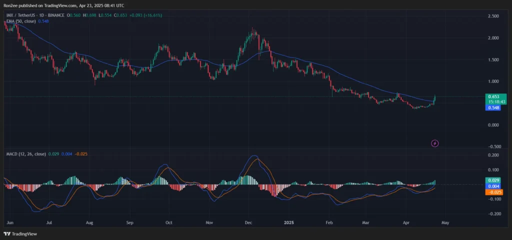 IMX không chỉ là một mã thông báo đơn thuần, mà còn là biểu tượng cho sự phát triển mạnh mẽ trong lĩnh vực trò chơi và NFT. Giá trị của nó hiện đang duy trì trên mức trung bình động 50 ngày, cho thấy người mua đang dần kiểm soát thị trường. Đường MACD cũng đang có xu hướng tăng, điều này đánh dấu một động lực mạnh mẽ đang hình thành, mặc dù vẫn còn ở dưới đường zero.