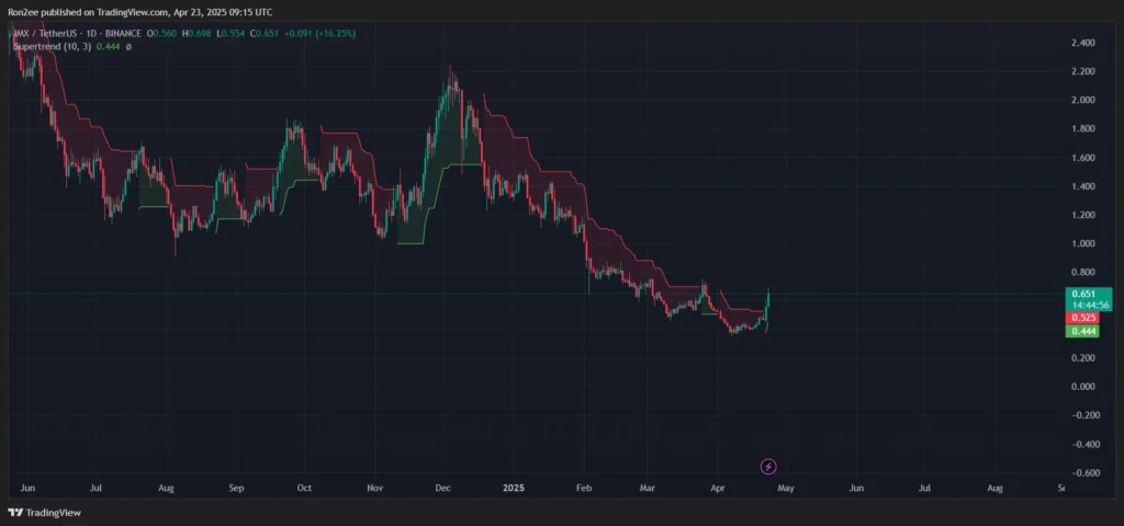 Chỉ báo Supertrend chuyển sang màu xanh lá cây cũng là một tín hiệu thêm vào cho thấy xu hướng đang có khả năng thuận lợi cho phe mua. Nếu IMX có thể duy trì sự phục hồi này và giữ vững mốc 1 đô la như một ngưỡng hỗ trợ, có khả năng nó có thể tiến xa hơn, vượt lên 1,6 đô la – ngưỡng kháng cự chính tiếp theo.