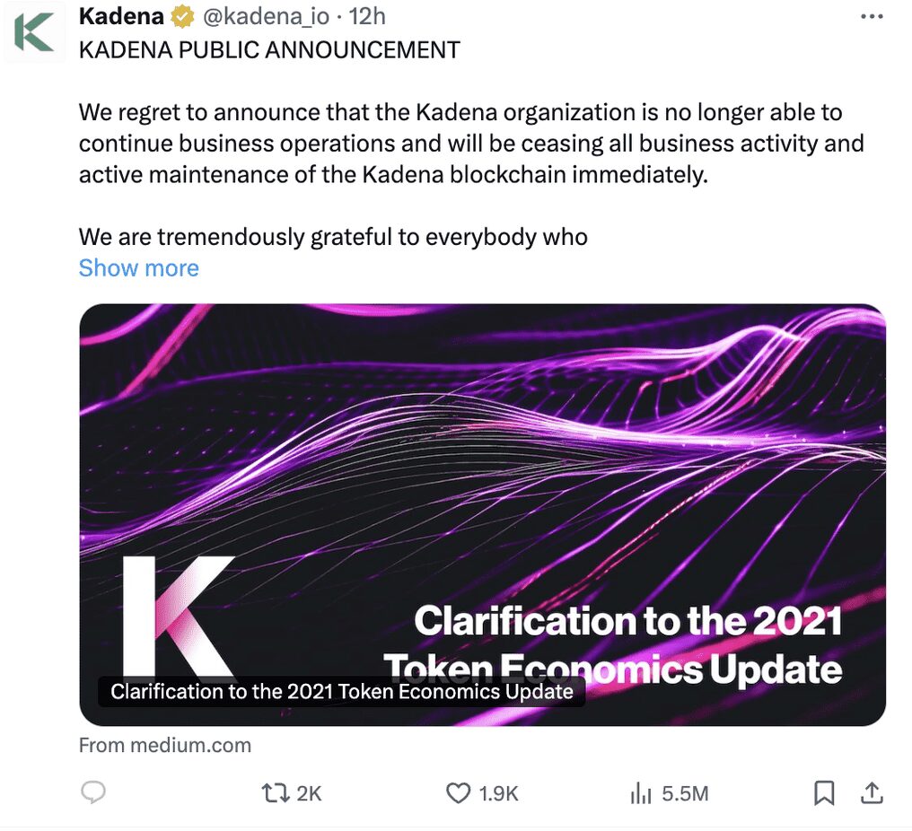 Dù sở hữu công nghệ đầy tiềm năng, nhưng Kadena không thể chống chọi với đà suy thoái chung của thị trường tiền mã hóa. Các yếu tố như giá token giảm mạnh, khối lượng giao dịch thấp và sự sụt giảm của nhà đầu tư đã khiến dự án mất khả năng tài chính để duy trì hoạt động. Trong tuyên bố chính thức, đội ngũ phát triển nhấn mạnh rằng “điều kiện thị trường” là lý do chính khiến họ phải tạm dừng mọi hoạt động.