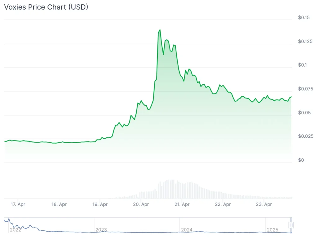 VOXEL đã trải qua một cú sốc lớn vào ngày 20 tháng 4, khi mã thông báo này lập tức tăng hơn 200% trong vòng chỉ 30 phút, từ mức thấp 0,04 đô la lên mức cao đỉnh điểm 13 đô la. Sự tăng giá mạnh mẽ này diễn ra khi VOXEL vừa trải qua một giai đoạn giảm giá nghiêm trọng, với mức thấp nhất mọi thời đại chỉ 0,02 đô la được ghi nhận vào ngày 17 tháng 4.