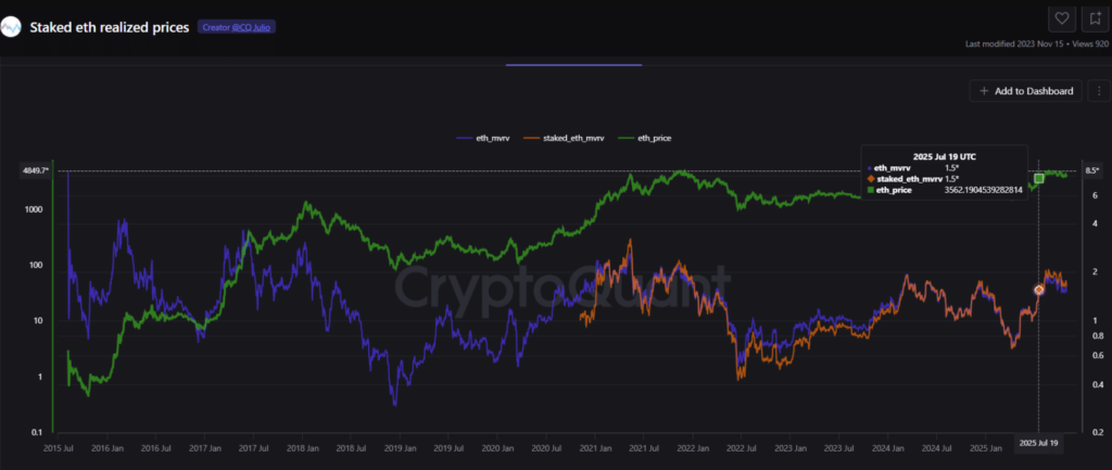 Theo dữ liệu từ CryptoQuant, kể từ tháng 7, tỷ lệ MVRV của ETH giữa hai nhóm – staking và lưu hành – bắt đầu tách biệt rõ rệt. Trước đó, cả hai đều dao động quanh mức 1,5, tương ứng với mức lợi nhuận chưa hiện thực hóa khoảng 50%.