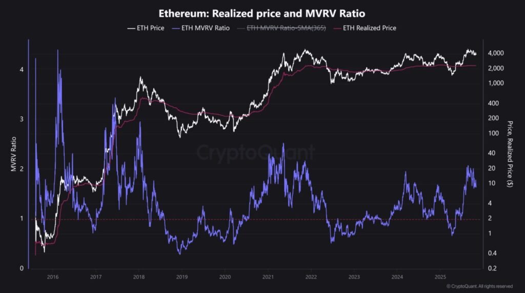 Biên lợi nhuận thu hẹp là tín hiệu cho thấy thị trường đang bước vào giai đoạn điều chỉnh và tích lũy. Trong lịch sử, mỗi khi MVRV giảm xuống dưới 1,0, đó thường là vùng tích lũy mạnh – thời điểm ETH lặng lẽ xây nền cho một chu kỳ tăng mới.