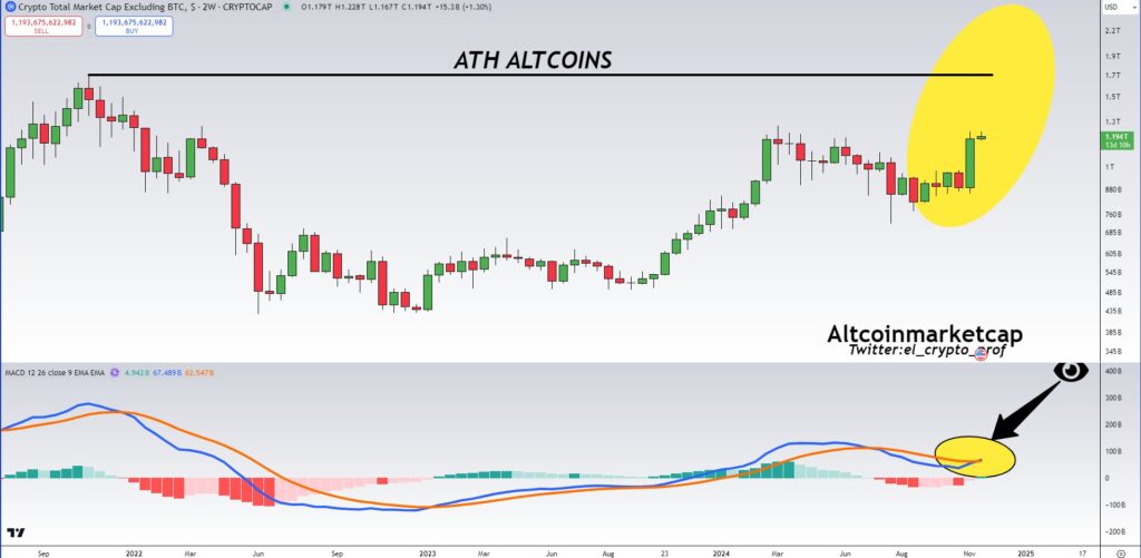Vốn hóa thị trường của Altcoin (TOTAL2) – chỉ số đo tổng vốn hóa của tất cả các đồng tiền mã hóa trừ Bitcoin – đang được kỳ vọng sớm quay trở lại đỉnh cao đã đạt được vào cuối năm 2021. Trong giai đoạn đó, vốn hóa TOTAL2 từng đạt khoảng 1.7 nghìn tỷ USD, phản ánh mức tăng trưởng đỉnh cao của các dự án altcoin trong cơn sốt tiền mã hóa.