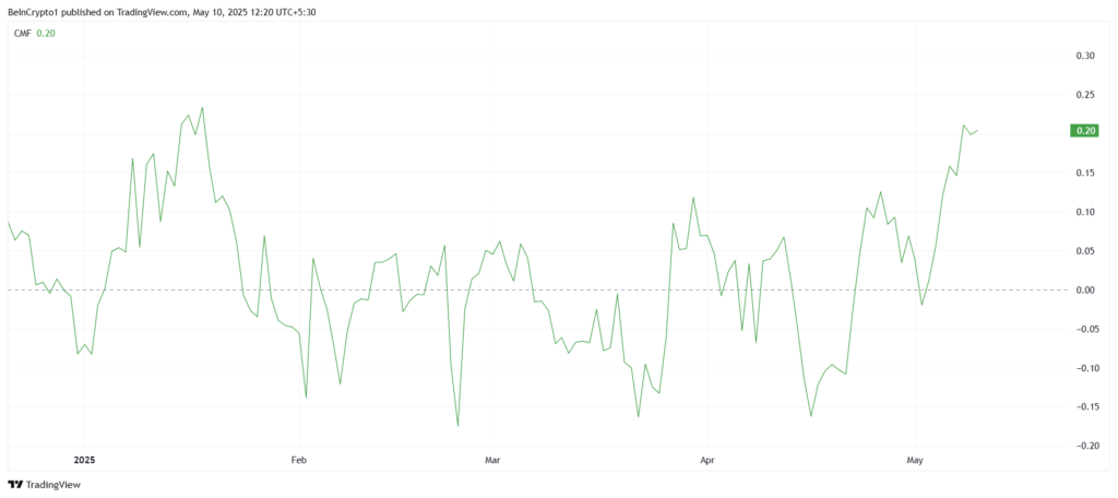 Các chỉ báo kỹ thuật hiện tại cũng đang hỗ trợ cho động lực tiêu cực tổng thể của SUI. Chỉ báo Chaikin Money Flow (CMF) đang ở mức cao nhất trong gần bốn tháng qua, điều này cho thấy rằng dòng tiền vào đang vượt trội hơn so với dòng tiền ra. Đây chính là minh chứng cho thấy các nhà đầu tư đang tích cực tìm cách khai thác xu hướng tăng giá của SUI, đồng thời thúc đẩy nhu cầu hơn nữa cho đồng coin này.