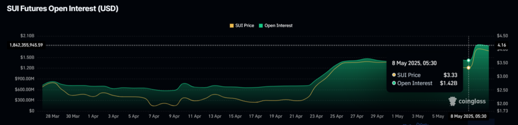 Với những dấu hiệu lạc quan đang lan tỏa, SUI đã trở thành lựa chọn hấp dẫn dưới mắt nhìn của nhiều nhà đầu tư, mở ra tiềm năng cho những biến động giá trong tương lai. Mới đây, lãi suất mở (Open Interest) của SUI đã ghi nhận mức tăng 28% chỉ trong 48 giờ, từ 1.42 tỷ USD lên 1.82 tỷ USD. Việc gia tăng 400 triệu USD này phản ánh sự thú vị đang dâng cao trong thị trường hợp đồng tương lai, với các nhà giao dịch háo hức tìm kiếm lợi nhuận từ động lực tăng trưởng này.