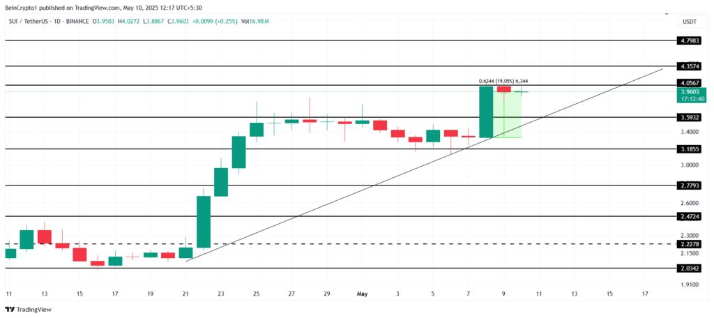 Tại thời điểm viết bài, giá SUI đang giao dịch ở mức 3.96 USD, với mức tăng gần 20% trong vòng 48 giờ qua. Đồng tiền này hiện đã tiến gần đến vùng kháng cự quan trọng 4.05 USD. Nếu SUI có thể vượt qua ngưỡng kháng cự này một cách thành công, điều này sẽ giúp duy trì xu hướng tăng trưởng đã kéo dài gần ba tuần, đồng thời mở ra cơ hội cho những đợt tăng giá tiếp theo. Việc chinh phục mức 4.05 USD sẽ là yếu tố quyết định cho sự phát triển tiếp theo của SUI.