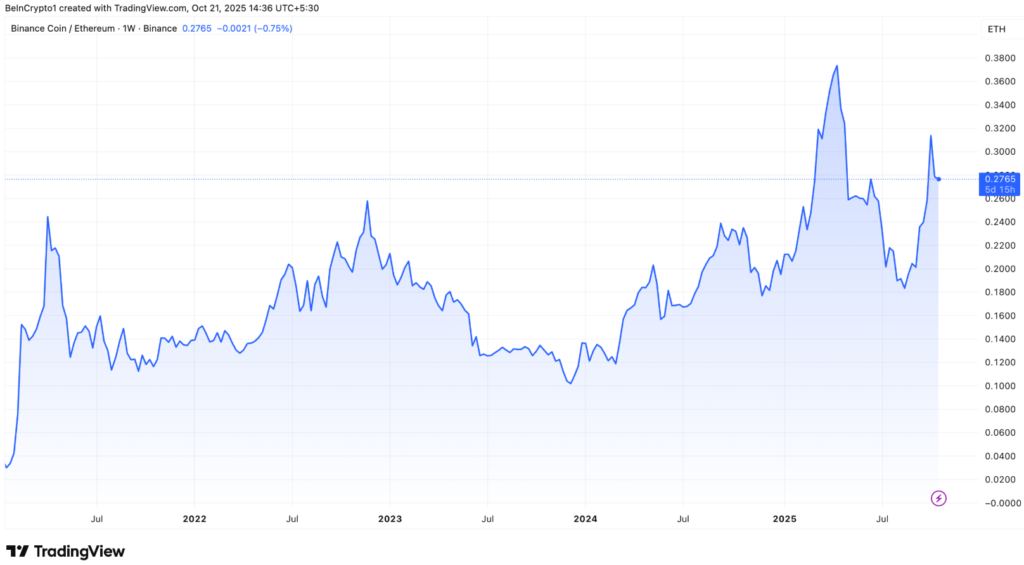 Biểu đồ BNB/ETH cho thấy một cấu trúc tăng giá dài hạn đang hình thành, dựa trên các chu kỳ mở rộng và điều chỉnh. Mặc dù thị trường vẫn còn biến động, bức tranh tổng thể cho thấy BNB đang duy trì lợi thế về mặt cấu trúc kỹ thuật.