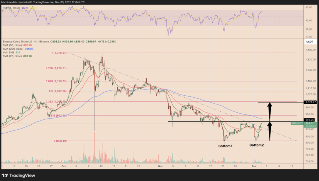 Trong phân tích kỹ thuật, mô hình hai đáy thường là tín hiệu cho sự đảo chiều xu hướng từ giảm sang tăng. Trên biểu đồ 4 giờ của BNB, mô hình này đã hình thành rõ ràng với các đáy tại vùng cầu 800–820 USD, cho thấy áp lực bán đã giảm mạnh và dòng tiền bắt đáy bắt đầu quay trở lại.