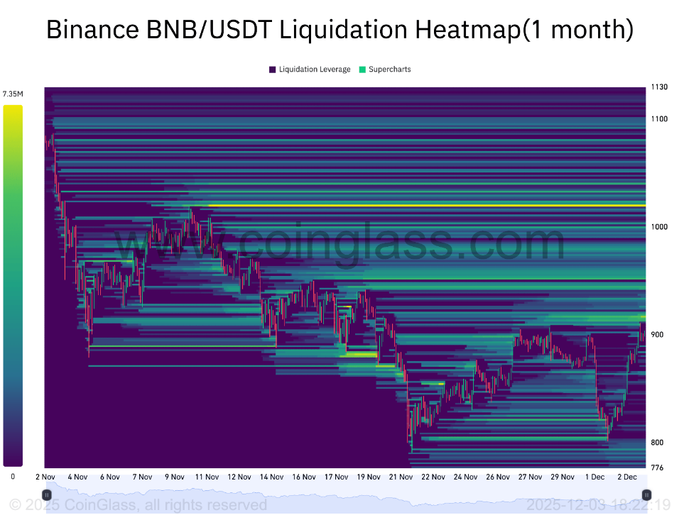 Trong bối cảnh giá tiếp tục tăng, các vị thế Short này sẽ bị buộc phải đóng, tạo ra lực mua bắt buộc lớn, đẩy mạnh xu hướng tăng giá. Quá trình này gọi là lực mua bắt buộc thanh lý (short squeeze), có thể là bước đệm quan trọng để BNB tiến tới mức 1.020 USD hoặc cao hơn trong tháng 12.