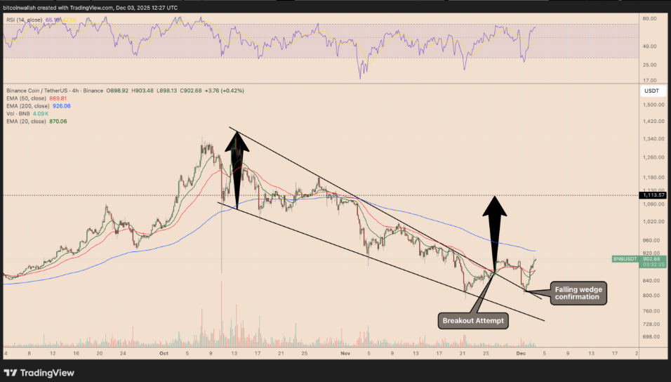 Gần đây, BNB đã thoát khỏi mô hình nêm giảm dài hạn, một cấu trúc thường báo hiệu khả năng đảo chiều tăng giá sau đợt bán tháo mạnh. Trên khung thời gian 4 giờ, giá đã phá vỡ và kiểm tra lại đường xu hướng giảm này, xác nhận tín hiệu breakout–retest.