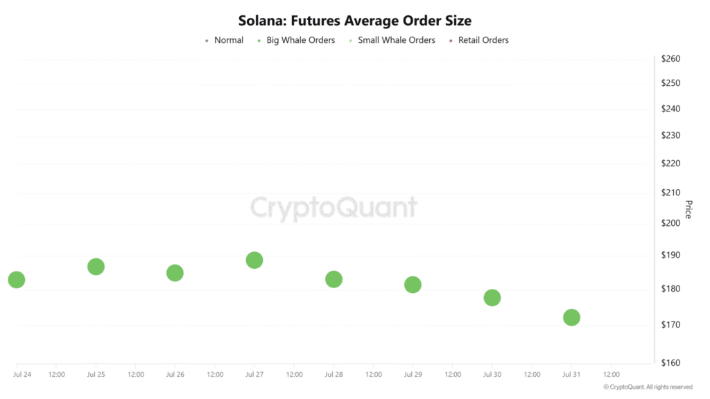 Mặc dù giao dịch trên thị trường giao ngay có phần chững lại, dữ liệu từ CryptoQuant cho thấy các cá voi đã chuyển hướng sang thị trường phái sinh. Kích thước lệnh trung bình trong thị trường hợp đồng tương lai đã tăng trở lại, trong khi lãi suất mở của Solana giảm 7,28% xuống còn 9,3 tỷ USD. Đồng thời, khối lượng giao dịch phái sinh tăng 4,62% lên 26,72 tỷ USD.