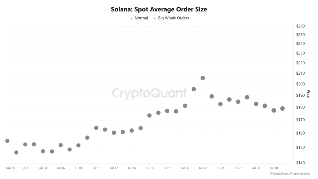 Sau thời gian im ắng trong giao dịch trên thị trường giao ngay, các cá voi của Solana đã trở lại, nhưng với những động thái không như kỳ vọng. Dựa trên dữ liệu từ CryptoQuant, khối lượng giao dịch trung bình trên thị trường giao ngay không ghi nhận sự tham gia mua bán chủ yếu từ nhóm này trong bối cảnh thị trường hồi phục. Điều này cho thấy họ đang đứng ngoài cuộc khởi sắc của giá.