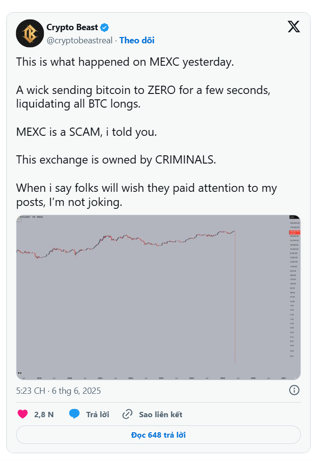 “Chúng tôi đã nhận được thông tin về việc một số tài khoản đăng tải thông tin sai lệch về nến BTC trên MEXC giảm xuống 0. Chúng tôi muốn nhấn mạnh rằng đây chỉ là một lỗi hiển thị trên TradingView vào ngày 05/06, và không có sự cố nào tương tự trên trang web chính thức của MEXC, nơi hoạt động vẫn diễn ra bình thường.”