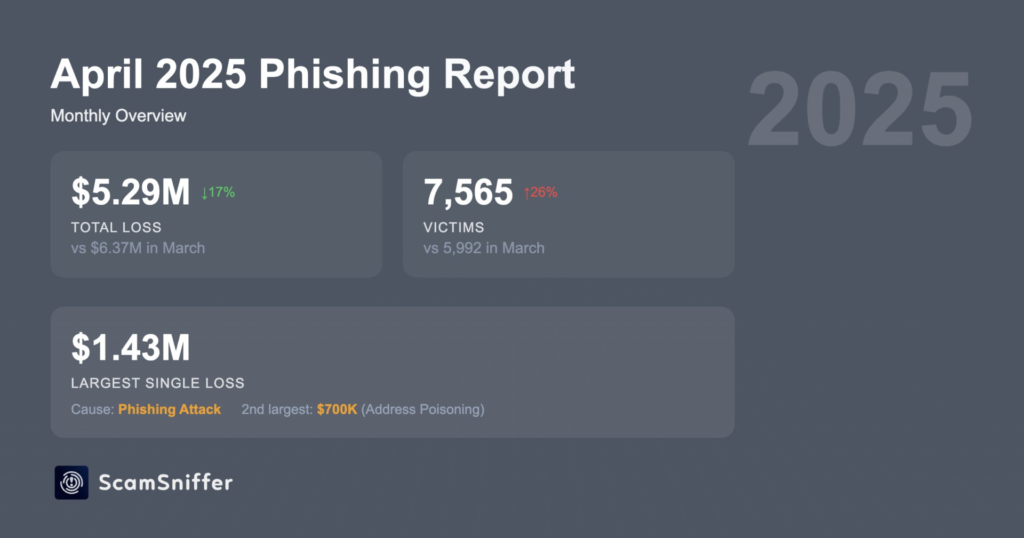 Trong tháng 04 năm 2025, các vụ lừa đảo phishing trong lĩnh vực tiền điện tử đã ghi nhận sự gia tăng đáng lo ngại về tính tinh vi và số lượng nạn nhân. Một báo cáo từ công ty bảo mật blockchain Scam Sniffer cho thấy, các nền tảng gian lận này đã đánh cắp tổng cộng 5.2 triệu USD từ hơn 7,000 người dùng, cho thấy một xu hướng tiếp diễn đúng như cảnh báo của các chuyên gia trong ngành.