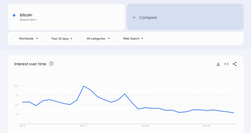 - Mức độ quan tâm của cộng đồng đối với Bitcoin đã tăng mạnh vào giữa tháng 10, sau đó giảm dần vào đầu tháng 11.