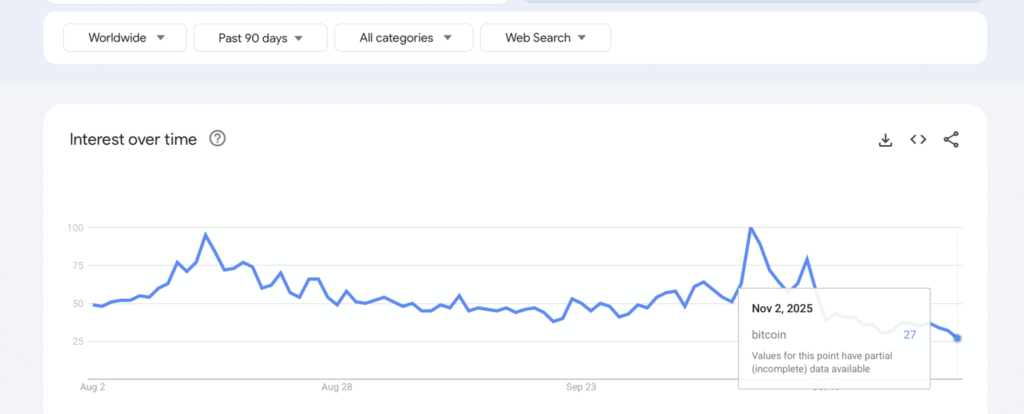 Dù thị trường Bitcoin đã ghi nhận mức giá đạt 110.000 USD vào ngày 3/11/2025, tăng 58,6% so với cùng kỳ năm ngoái, sự quan tâm tìm kiếm không hoàn toàn đồng bộ. Điều này cho thấy, giá trị thị trường và mức độ tìm kiếm của cộng đồng không luôn đi đôi, phản ánh sự đa dạng trong các yếu tố tác động đến hành vi người dùng.