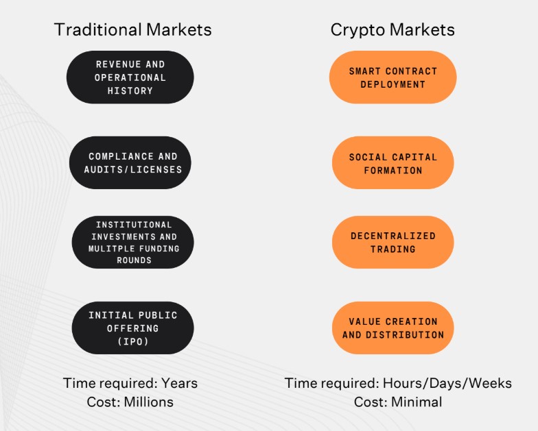 Truyền thống của việc huy động vốn thông qua các đợt chào bán công khai (IPO) gây khó khăn cho nhiều công ty khởi nghiệp, yêu cầu phải chứng minh lịch sử hoạt động và tiềm năng tài chính. Tuy nhiên, với blockchain, các công ty có thể phát hành token để huy động vốn, điều này giúp giản lược các yêu cầu về thời gian và chi phí. Sự đổi mới này đã tạo ra một mô hình tài chính dân chủ hóa, mang tính khả thi cho cả những dự án nhỏ lẻ.