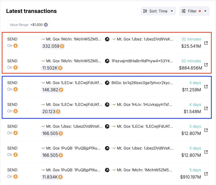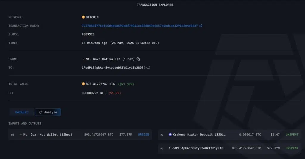 Vào ngày 25 tháng 3, công ty phân tích chuỗi khối Arkham Intelligence đã ghi nhận việc chuyển tiền từ ví của Mt. Gox. Trong số giao dịch này, 893 BTC, tương đương khoảng 78 triệu đô la, đã được chuyển đến một địa chỉ mới, trong khi 10.608 BTC, trị giá khoảng 929 triệu đô la, được chuyển đến một ví khác cũng thuộc quyền kiểm soát của Mt. Gox. Đáng chú ý, một lượng rất nhỏ 0,000017 BTC cũng đã được gửi đến sàn Kraken, có thể được coi là một giao dịch thử nghiệm.