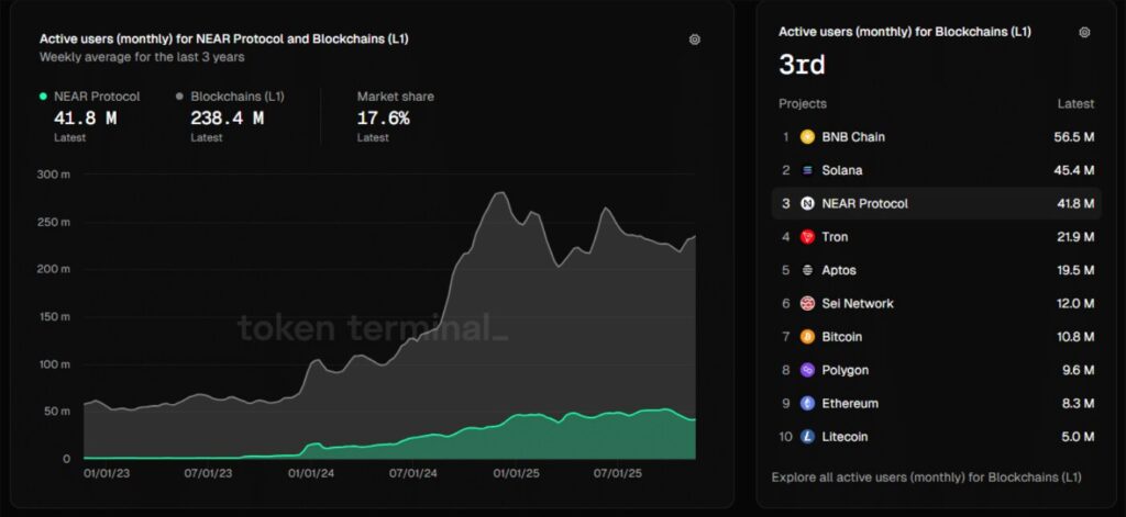 Theo các dữ liệu mới nhất, số lượng người dùng hoạt động hàng tháng trên các blockchain Layer-1 đã tăng mạnh, trong đó NEAR chiếm khoảng 17% tổng số người dùng, đứng thứ ba sau Solana và Binance Smart Chain (BNB). Cụ thể, số lượng người dùng NEAR hiện đạt hơn 41 triệu, cho thấy khả năng mở rộng và sức hút của hệ sinh thái này.