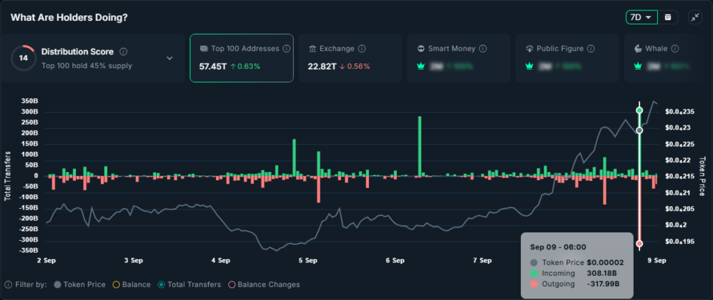 Dù vậy, điểm phân phối (Distribution Score) vẫn đứng ở mức 14 vào thời điểm hiện tại, cho thấy mức độ tập trung cao. Top 100 ví đang giữ 44% tổng nguồn cung BONK.