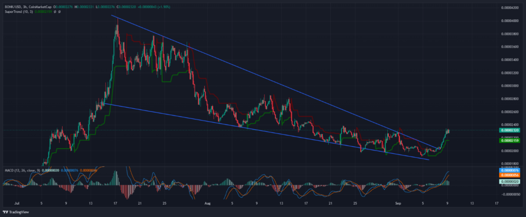 Sự tăng trưởng của BONK diễn ra sau khi đồng này đã bứt phá khỏi giai đoạn hợp nhất kéo dài hai tháng, với mô hình nêm giảm dần hình thành kể từ thời điểm đạt đỉnh vào ngày 17/7 với mức giá 0,00004041 USD.