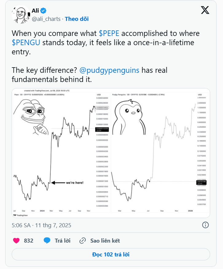 Ali nhận định rằng “Chỉ cần so sánh thành công của PEPE với vị thế hiện tại của PENGU, bạn sẽ thấy đây là một cơ hội hiếm có. Điểm khác biệt lớn nhất? Pudgy Penguins có những yếu tố thực sự ủng hộ phía sau.” Một yếu tố quan trọng khác mà Ali chỉ ra là “đợt retest tăng giá chuẩn sách giáo khoa” của PENGU vào ngày 10 tháng 7 cùng với sự dự đoán rằng giá có thể đạt 0,06 đô la vào tháng 8, tùy thuộc vào sự phê duyệt ETF PENGU của Cơ quan Chứng khoán và Giao dịch Hoa Kỳ (SEC).