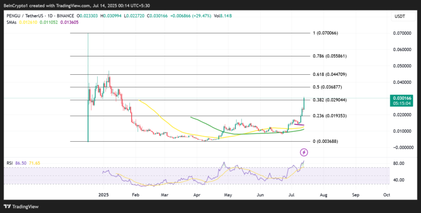 Chỉ báo RSI cũng xác nhận xu hướng tăng mạnh, liên tục tạo ra những đỉnh và đáy cao hơn, củng cố thêm cho đà phục hồi của PENGU.