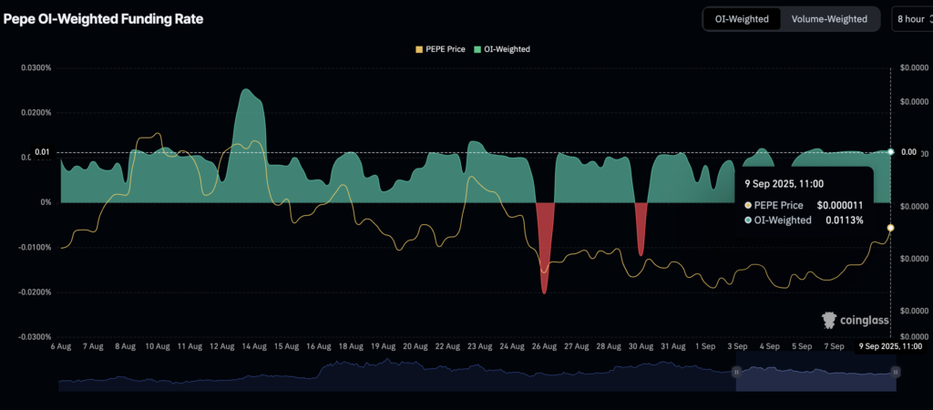 Một trong những dấu hiệu rõ nét cho thấy sự phục hồi trong tâm lý thị trường là sự gia tăng của hợp đồng mở (Open Interest – OI) của các hợp đồng tương lai PEPE. Trong giai đoạn giảm giá, OI có lúc giảm mạnh nhưng hiện đã phục hồi đáng kể, với mức trung bình đạt khoảng 609 triệu USD, tăng từ 531 triệu USD vào thứ Sáu. Sự quay trở lại này cho thấy rằng nhà đầu tư nhỏ lẻ đang bắt đầu quan tâm trở lại, và nếu xu hướng này tiếp tục, OI có thể đạt mốc 1 tỷ USD, từ đó củng cố niềm tin vào khả năng phục hồi mạnh mẽ của PEPE.