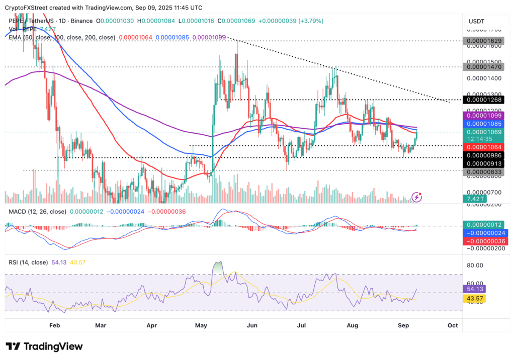 Trên biểu đồ kỹ thuật, PEPE hiện đang đối mặt với ngưỡng kháng cự quan trọng tại đường EMA 100 ngày, nằm quanh mức 0,0000108 USD. Việc PEPE vượt qua được ngưỡng EMA 50 ngày (0,0000106 USD) cho thấy một bước tiến quan trọng, vì giữ vững trên các đường trung bình động này thường mở ra khả năng tăng giá tiếp theo.