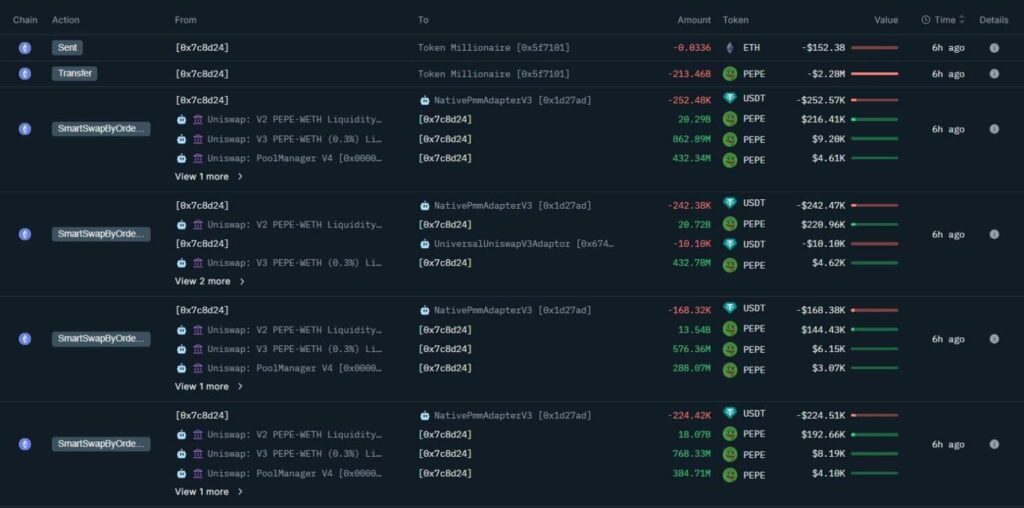 Theo dữ liệu từ Nansen, hoạt động mua vào mạnh mẽ của các nhà đầu tư cá voi đang làm dấy lên sự quan tâm đối với đồng tiền số Pepe (PEPE). Một phân tích từ Onchain Lens tiết lộ rằng hai nhà đầu tư cá voi đã đầu tư hơn 3,5 triệu USD để mua tới 303,19 tỷ PEPE. Đây là một tín hiệu tích cực cho những nhà đầu tư dài hạn, tuy nhiên, cần lưu ý rằng hoạt động giao dịch của cá voi hiện tại vẫn chưa đạt mức độ sôi động như những đợt lên xuống giá trong quá khứ, đặc biệt là giai đoạn tháng 11 đến tháng 12 năm 2024 hay tháng 5 năm 2025.