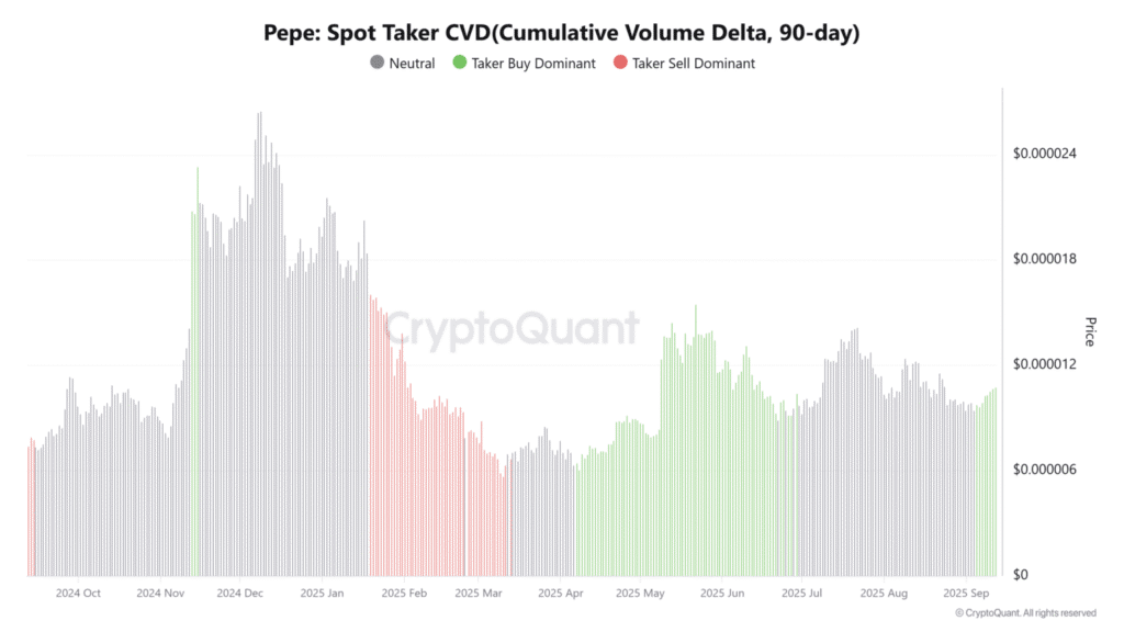 Trong giai đoạn đó, PEPE đã chứng kiến sự bùng nổ mạnh mẽ, với sự tham gia nhiệt tình từ cả nhà đầu tư nhỏ lẻ và cá voi. Theo thông tin từ CryptoQuant, chỉ báo Spot Taker CVD cho thấy khối lượng giao dịch mua vào trong tuần qua đang gia tăng đáng kể, vượt trội so với ba tháng trước đó. Đây là một dấu hiệu tích cực, gợi nhớ về khoảng thời gian từ tháng 4 đến tháng 5 năm 2025, khi PEPE ghi nhận mức tăng trưởng lên tới 146% chỉ trong vòng chưa đầy hai tháng.