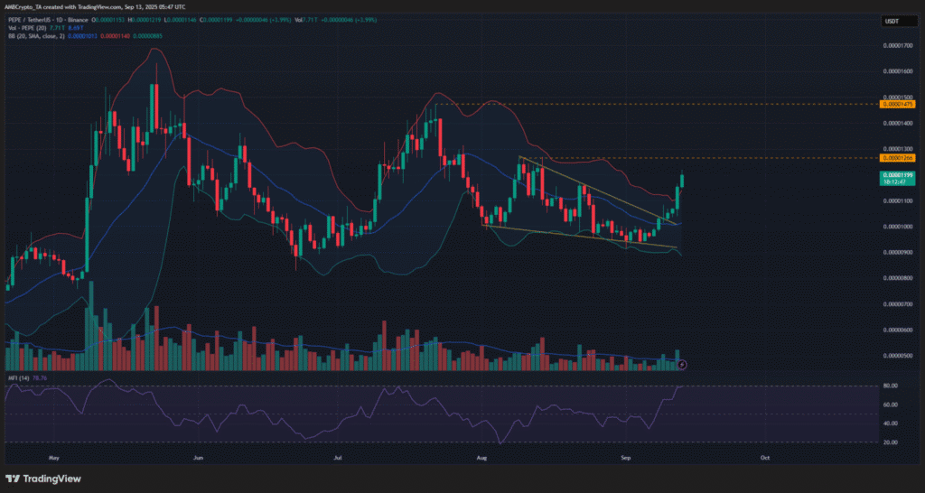 Chỉ báo MFI đã xác nhận động lực tăng trưởng mạnh mẽ và áp lực mua vào, tuy nhiên, vẫn chưa đạt đến trạng thái quá mua trên khung thời gian hàng ngày. Từ tháng 5 đến nay, thị trường PEPE vẫn duy trì một xu hướng tăng bền vững, mặc dù có một giai đoạn điều chỉnh nhẹ về mức gần 0,00001 USD vào tháng 8.