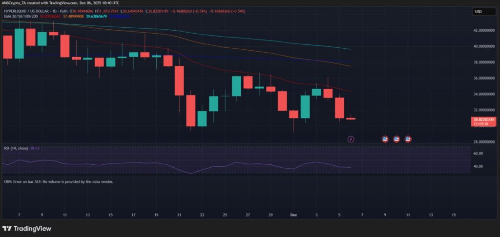 - Hiện tại, giá HYPE nằm dưới các đường trung bình động quan trọng, cho thấy xu hướng giảm mạnh.