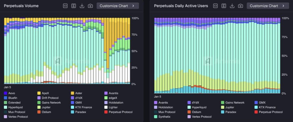- Các nền tảng mới như Lighter và Aster (ASTER) đã nhanh chóng chiếm lĩnh thị phần, cạnh tranh trực tiếp với các ông lớn truyền thống.