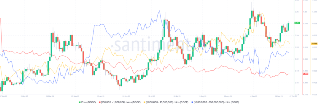Theo dữ liệu on-chain từ Santiment, các hoạt động tích lũy của các nhóm nhà đầu tư lớn đang diễn ra sôi động. Cụ thể, hai nhóm cá voi nắm giữ từ 100.000–1 triệu DOGE và 10–100 triệu DOGE đã tích lũy thêm tổng cộng khoảng 390 triệu token từ ngày 23/9.