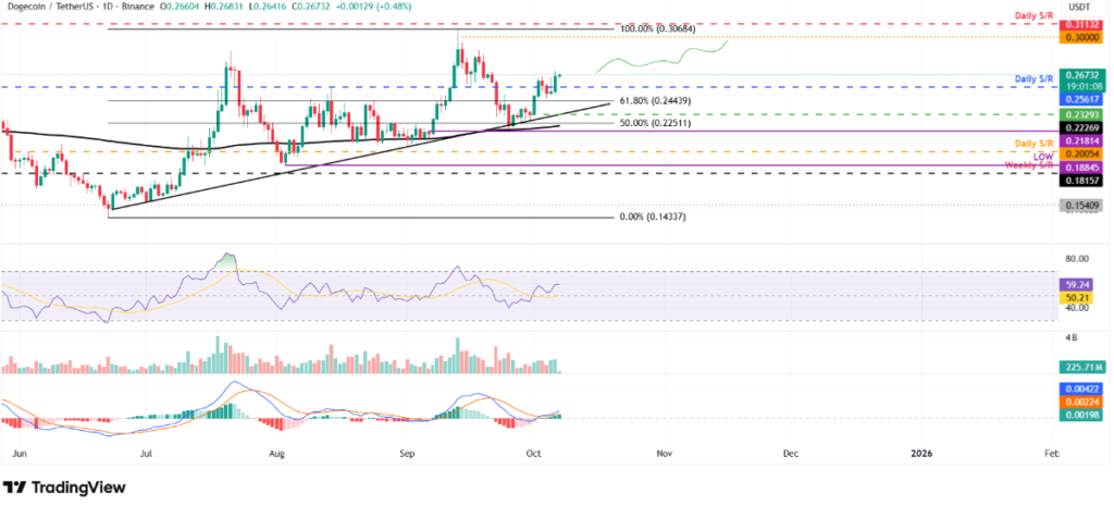 Giá DOGE đã tìm thấy điểm tựa vững chắc tại vùng Fibonacci thoái lui 50% quanh mốc 0,22 USD vào ngày 26/9. Sau đó, meme coin này đã bật tăng gần 20%, đóng cửa trên ngưỡng kháng cự 0,25 USD vào đầu tuần này.