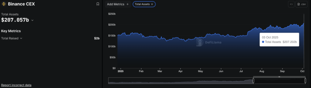 Tổng tài sản ký gửi trên sàn Binance (CEX) đã đạt mức kỷ lục 207,06 tỷ USD, phản ánh hoạt động sôi động của thị trường tiền mã hóa toàn cầu. Điều này giúp củng cố nhu cầu sử dụng BNB như một phương tiện thanh toán, giao dịch và đầu tư trong hệ sinh thái Binance.
